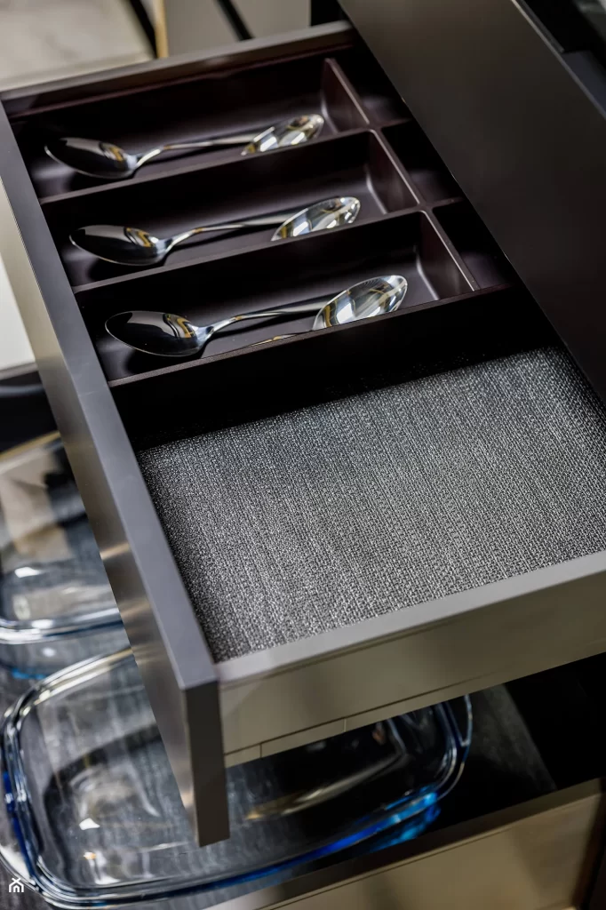 Zestawienie tych dwóch materiałów tworzy wysmakowaną kompozycję, która doskonale współgra również z czarnym marmurem, podkreślając minimalistyczną, elegancką linię zabudowy.