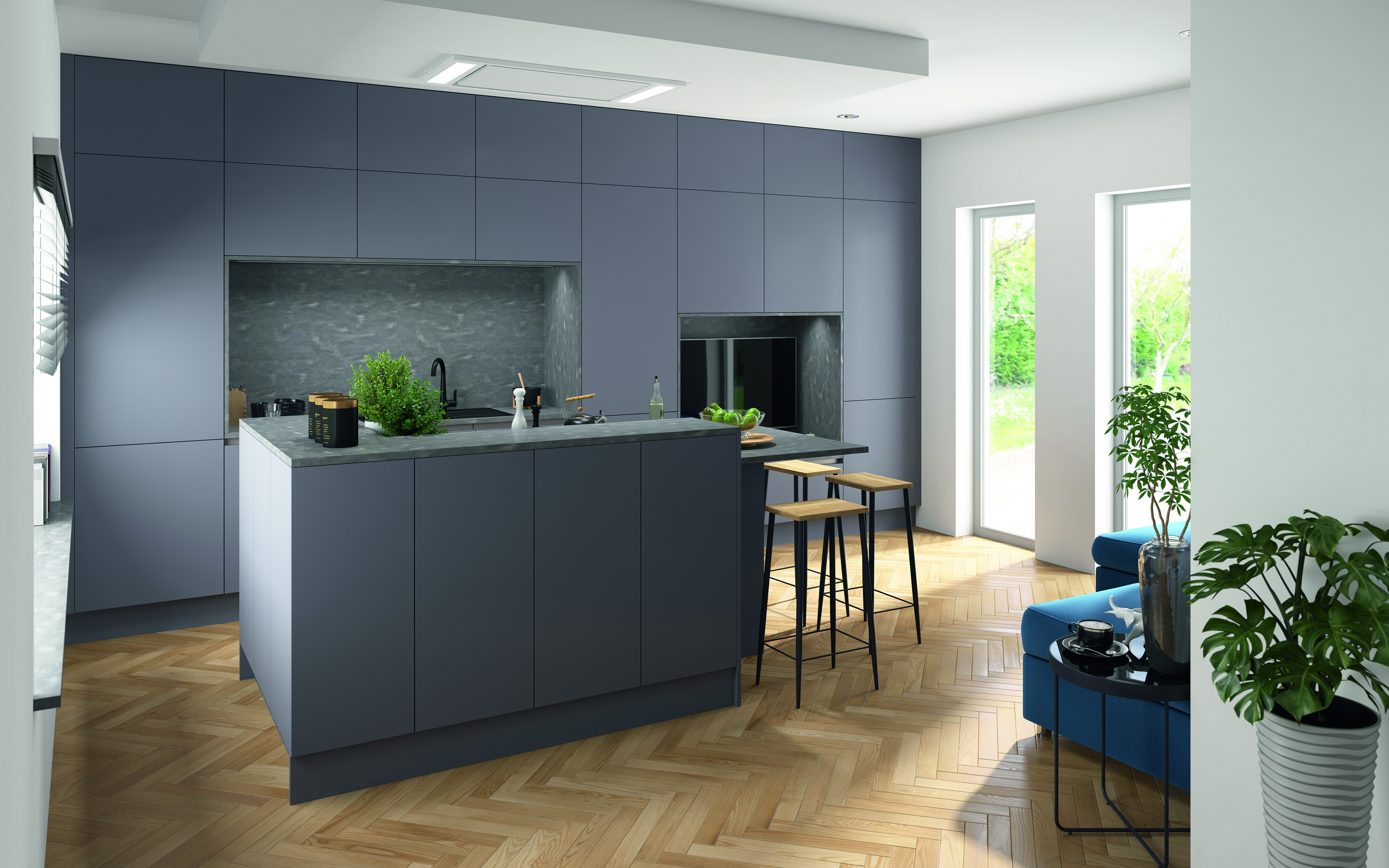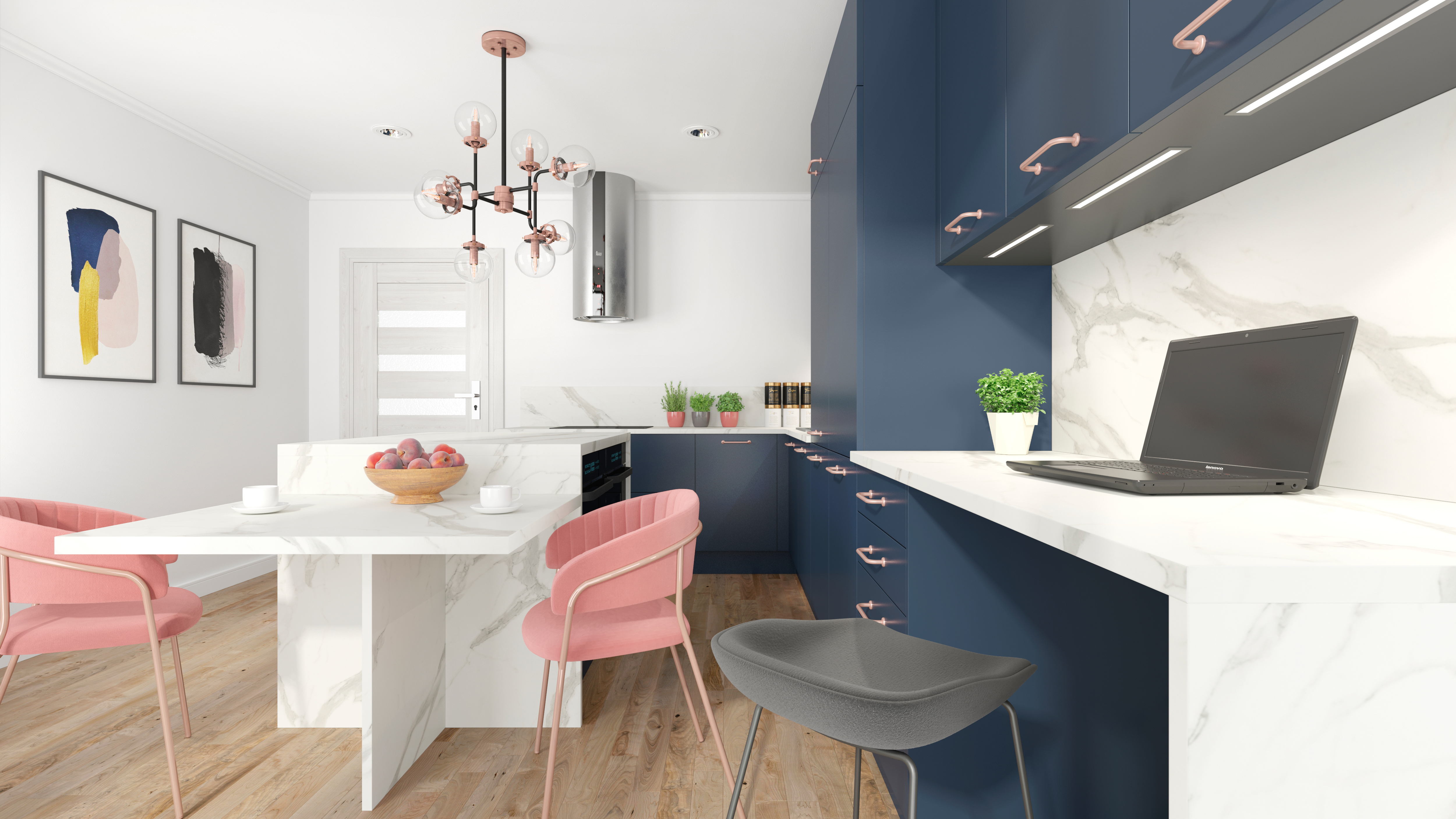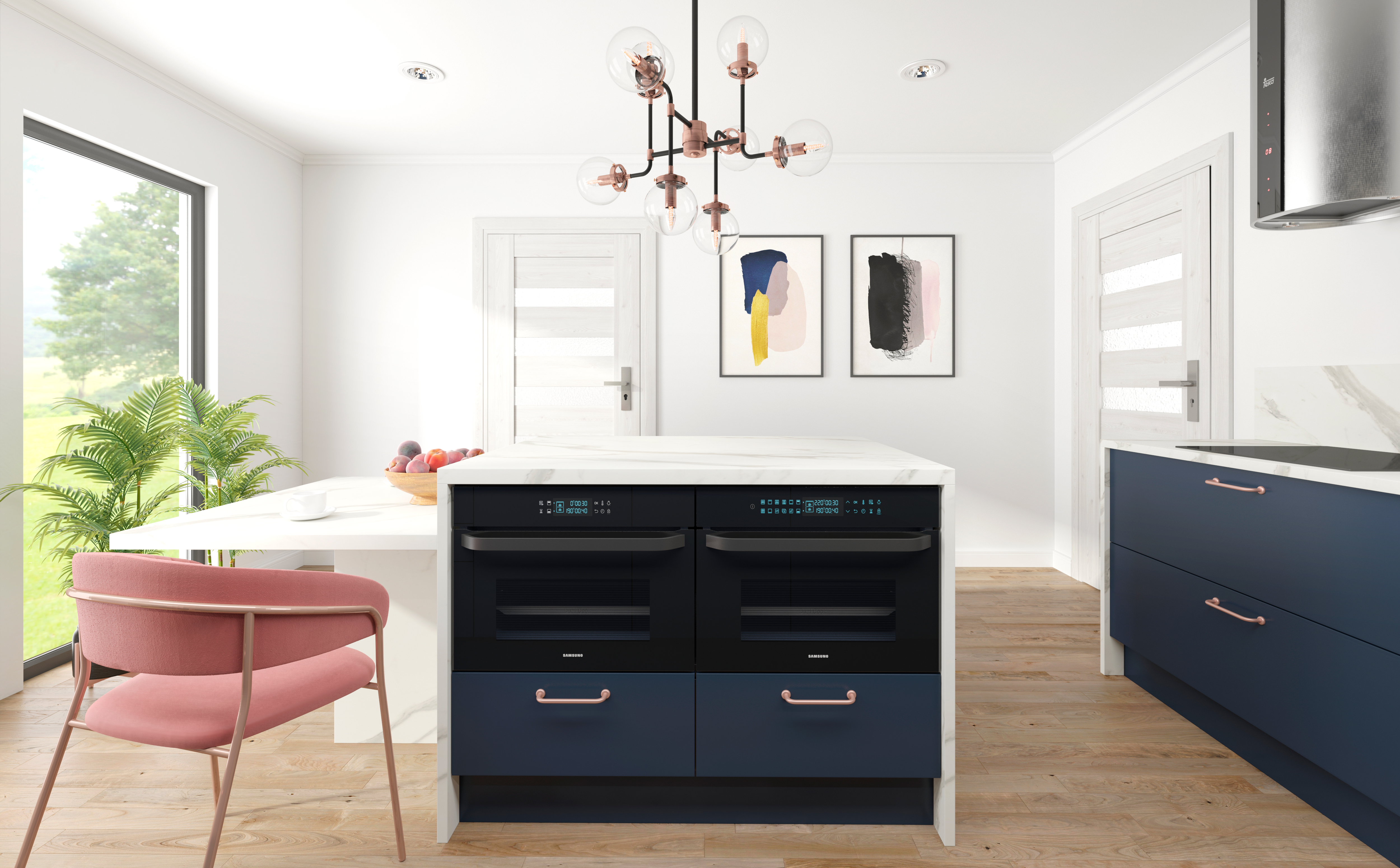 Projekt stworzony z myślą o nowoczesnych, multifunkcjonalnych przestrzeniach, w których granice pomiędzy strefami zanikają. Aksamitny, matowy granat nadaje kuchni elegancji, harmonii i poczucia bezpieczeństwa, tworząc wyrazistą bazę stylistyczną.