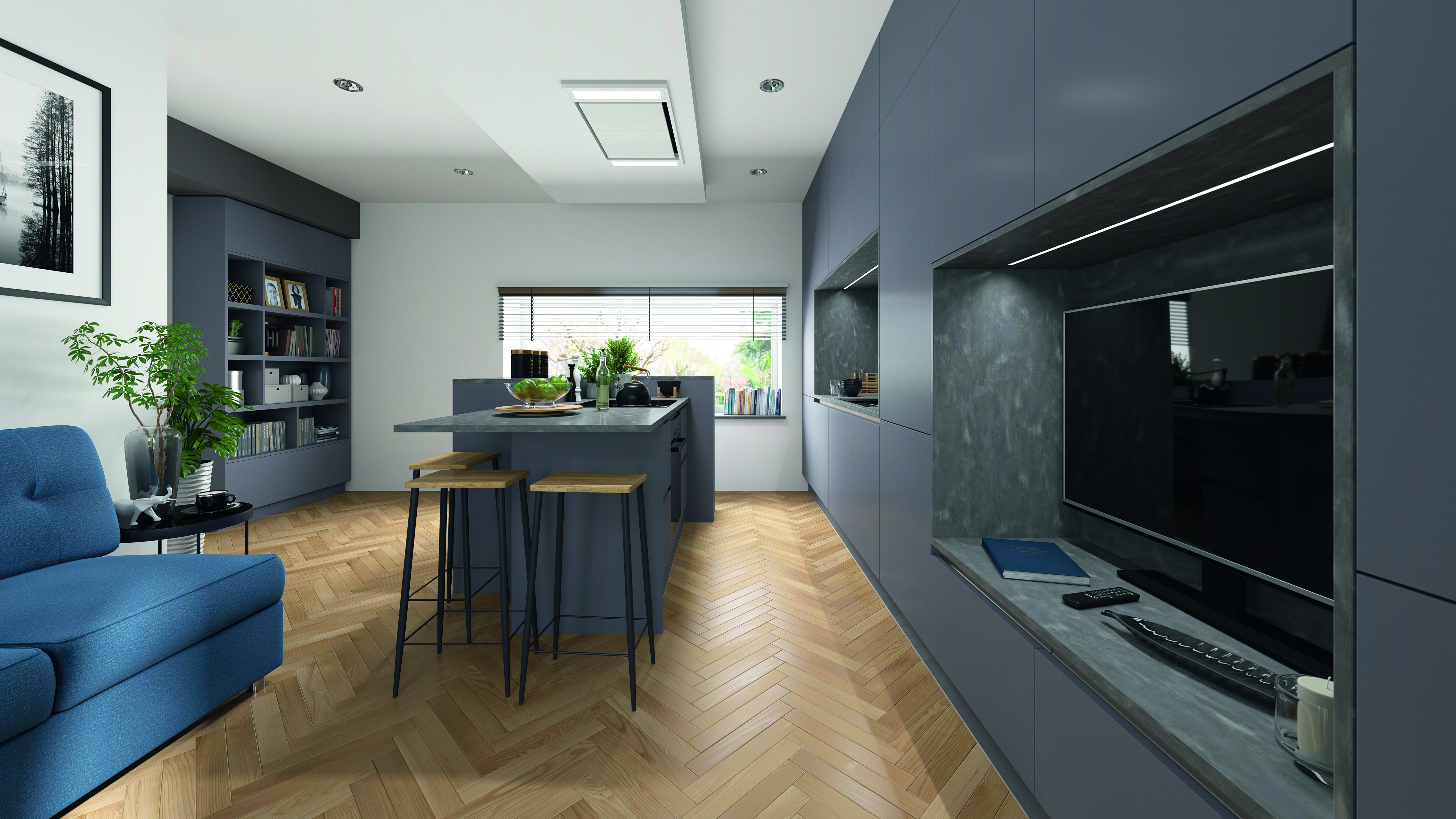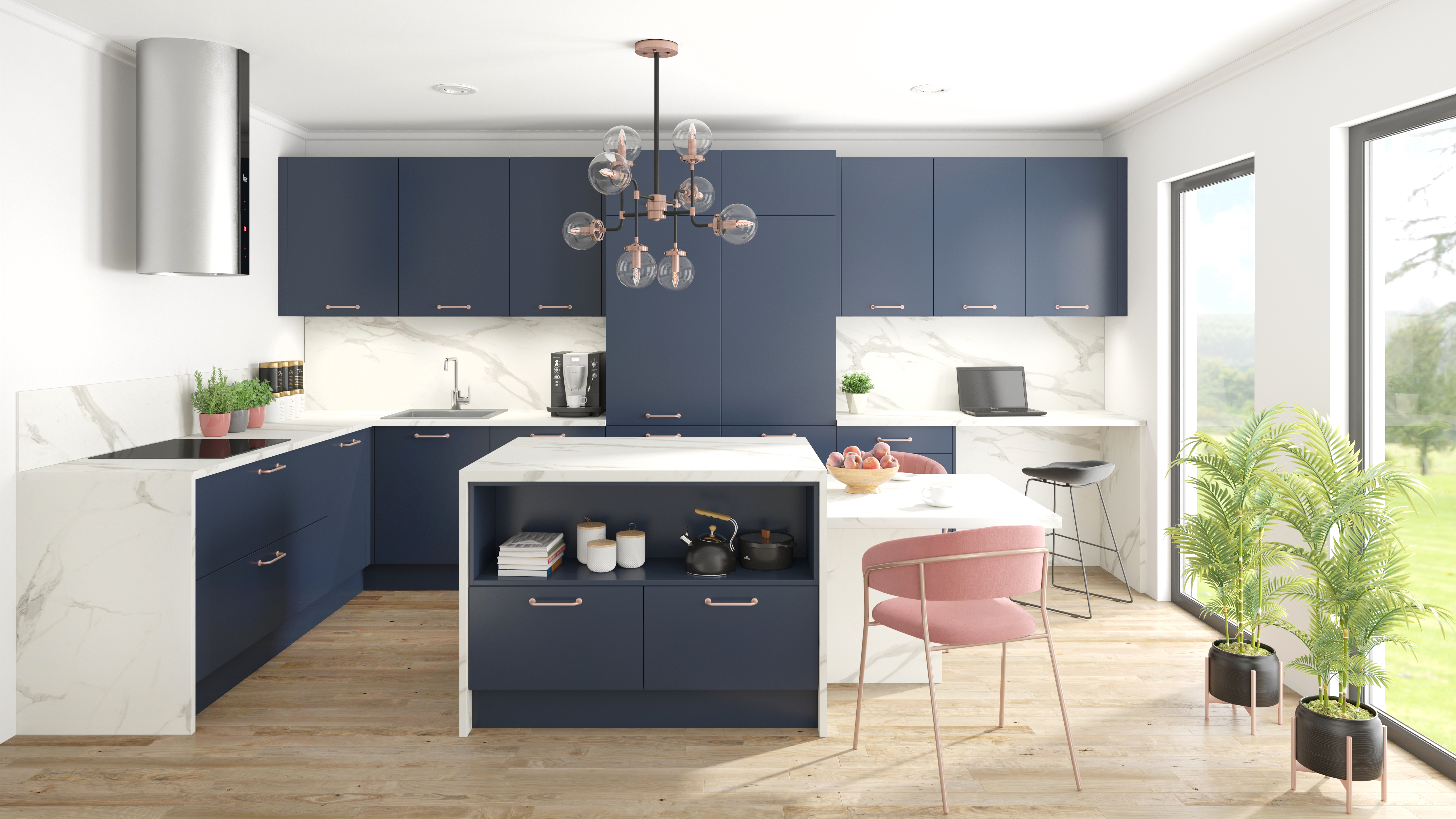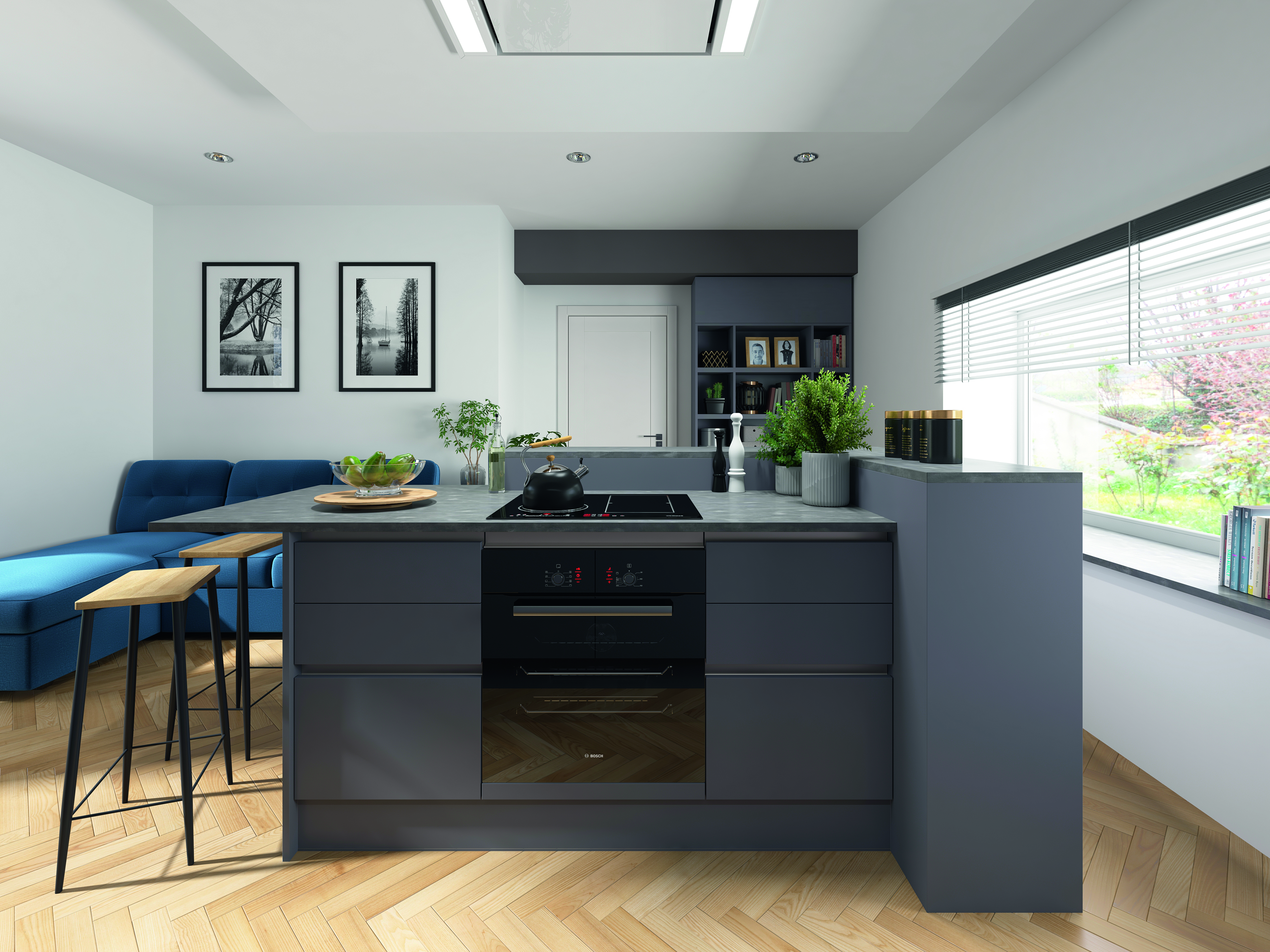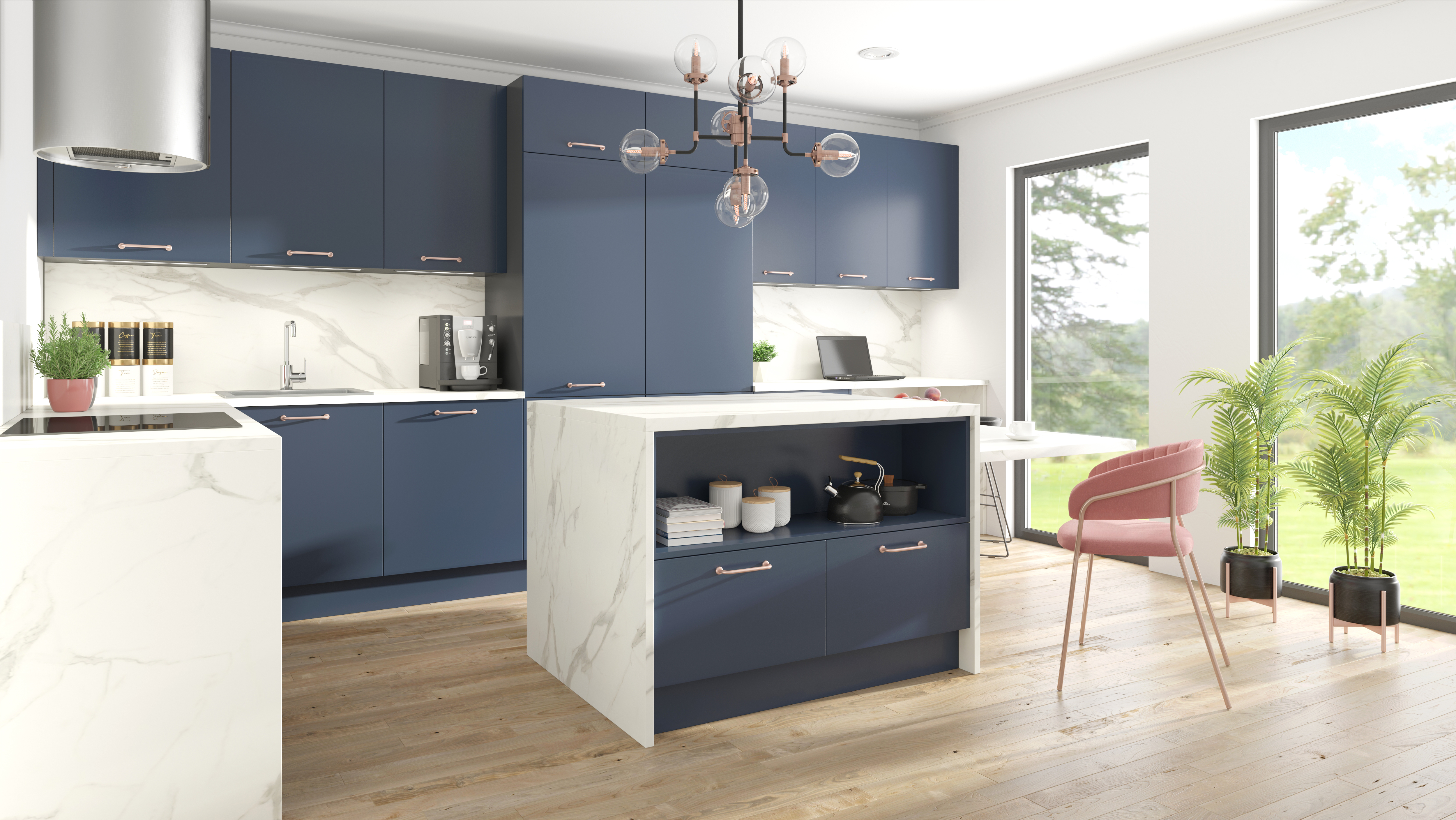 Projekt stworzony z myślą o nowoczesnych, multifunkcjonalnych przestrzeniach, w których granice pomiędzy strefami zanikają. Aksamitny, matowy granat nadaje kuchni elegancji, harmonii i poczucia bezpieczeństwa, tworząc wyrazistą bazę stylistyczną.