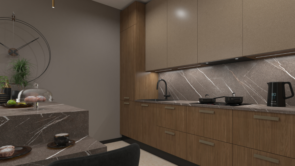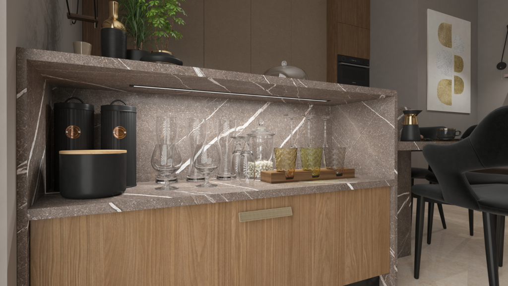 Zabudowa została zaprojektowana tak, by była elastyczna, adaptowalna i ergonomiczna, odpowiadając na potrzeby współczesnego domu. Veluto łączy nowoczesną estetykę z praktycznymi rozwiązaniami, zapewniając wygodę codziennego użytkowania w otwartej, wielofunkcyjnej przestrzeni.