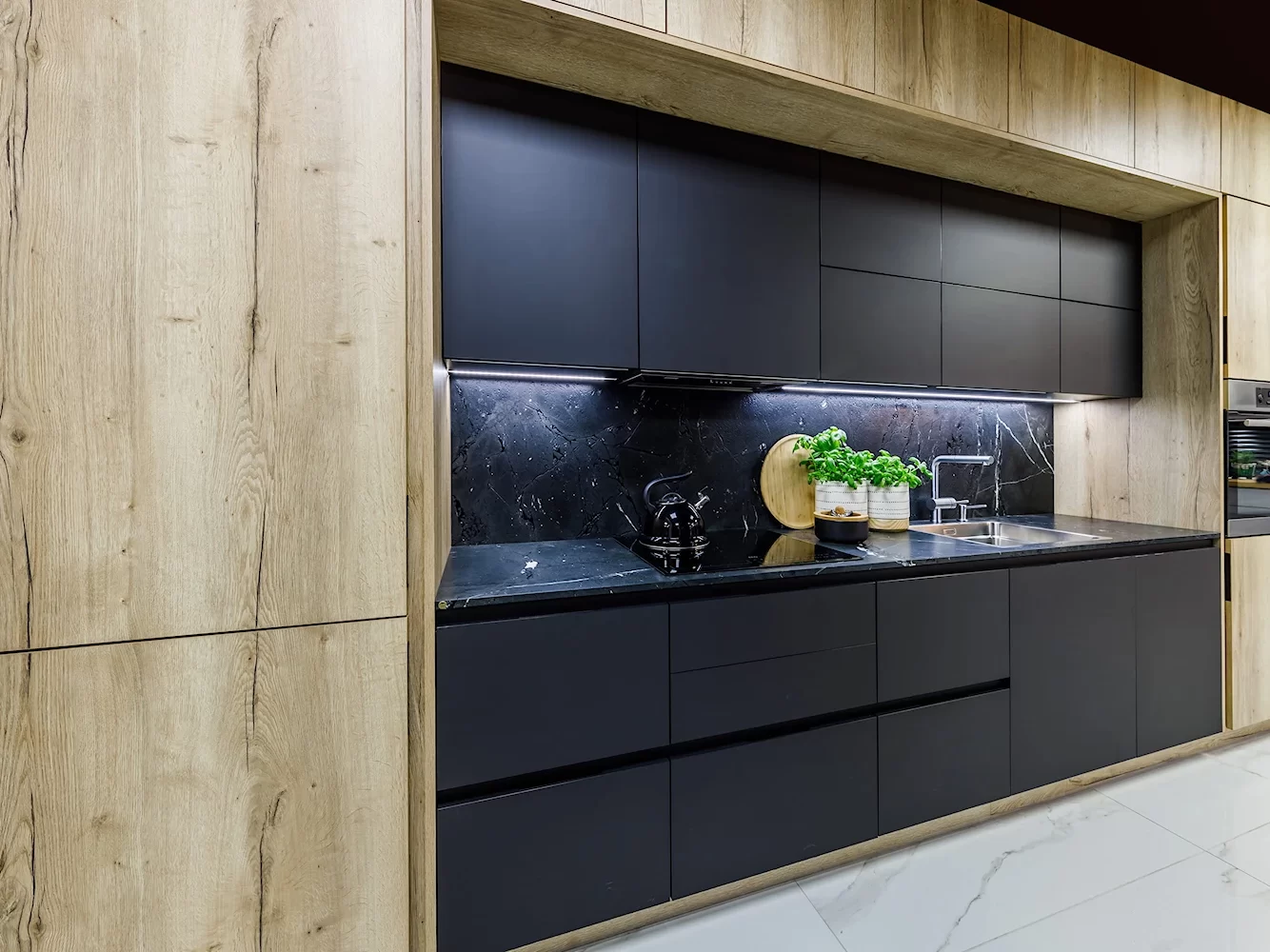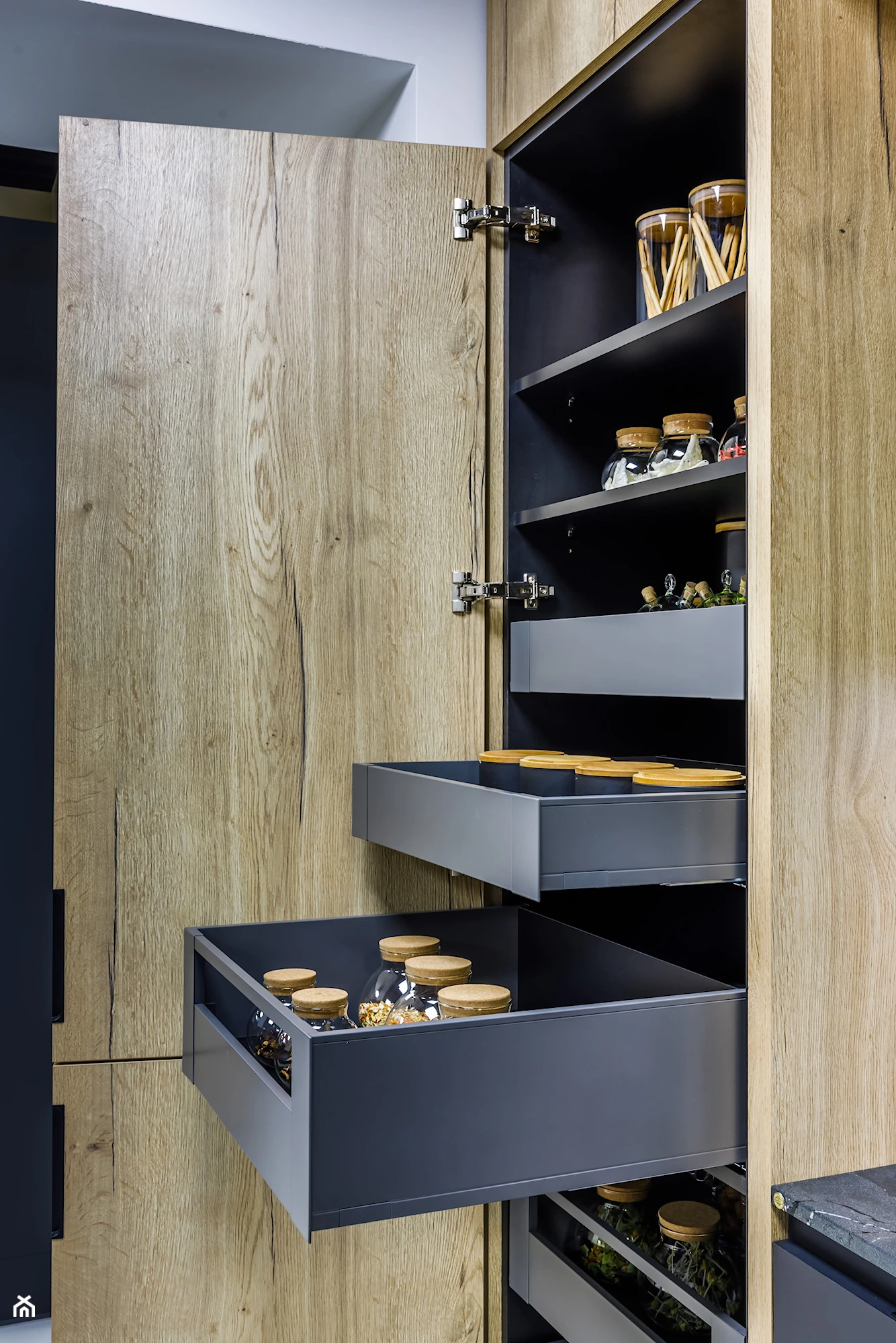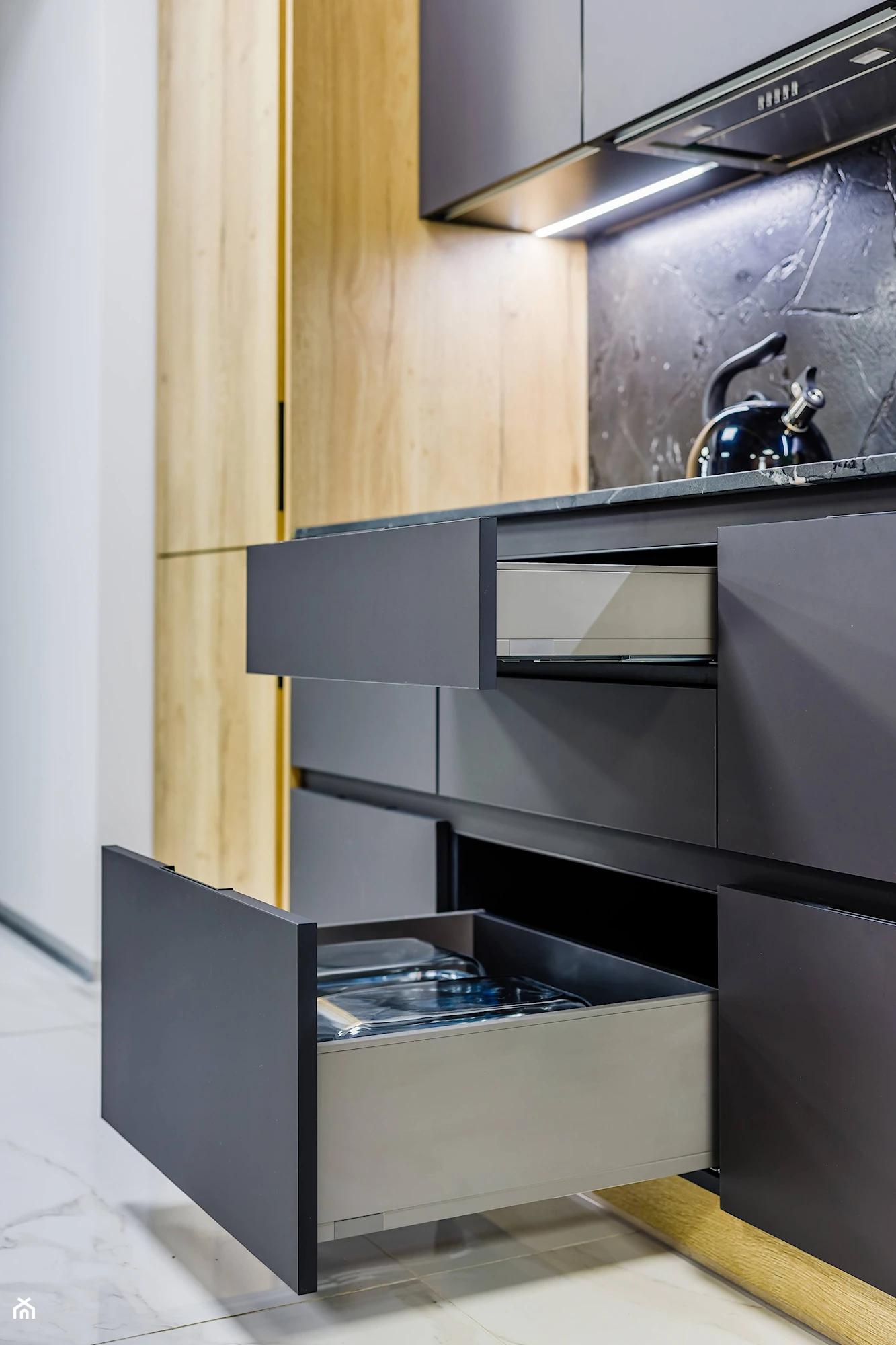 Zestawienie tych dwóch materiałów tworzy wysmakowaną kompozycję, która doskonale współgra również z czarnym marmurem, podkreślając minimalistyczną, elegancką linię zabudowy.